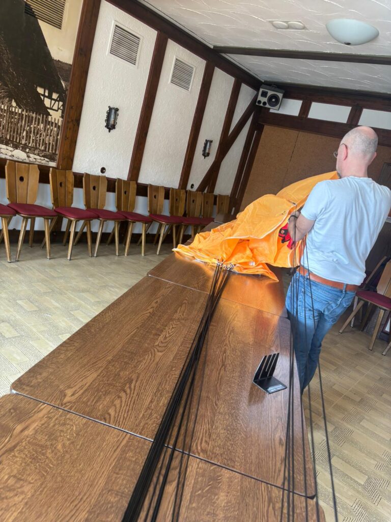 Das jährliche Fallschirmpacken ist daher ein unverzichtbarer Bestandteil des sicheren Flugbetriebs im Verein. Neben der technischen Sorgfalt erfordert diese Tätigkeit auch viel Erfahrung, Konzentration und Verantwortungsbewusstsein.