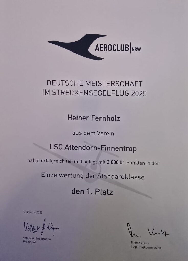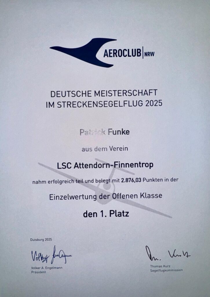 Die Urkunden zur Deutschen Meisterschaft wurden vom Aeroclub Nordrhein-Westfalen verliehen und bestätigen die außergewöhnlichen Leistungen der beiden Segelflieger in einem der anspruchsvollsten Wettbewerbe des Segelflugsports.